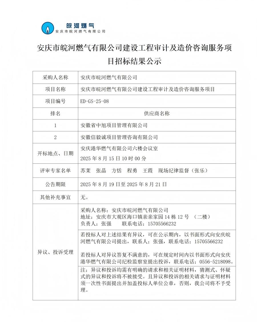 安慶市皖河燃氣有限公司建設工程審計及造價(jià)咨詢(xún)服務(wù)項目招標結果公示